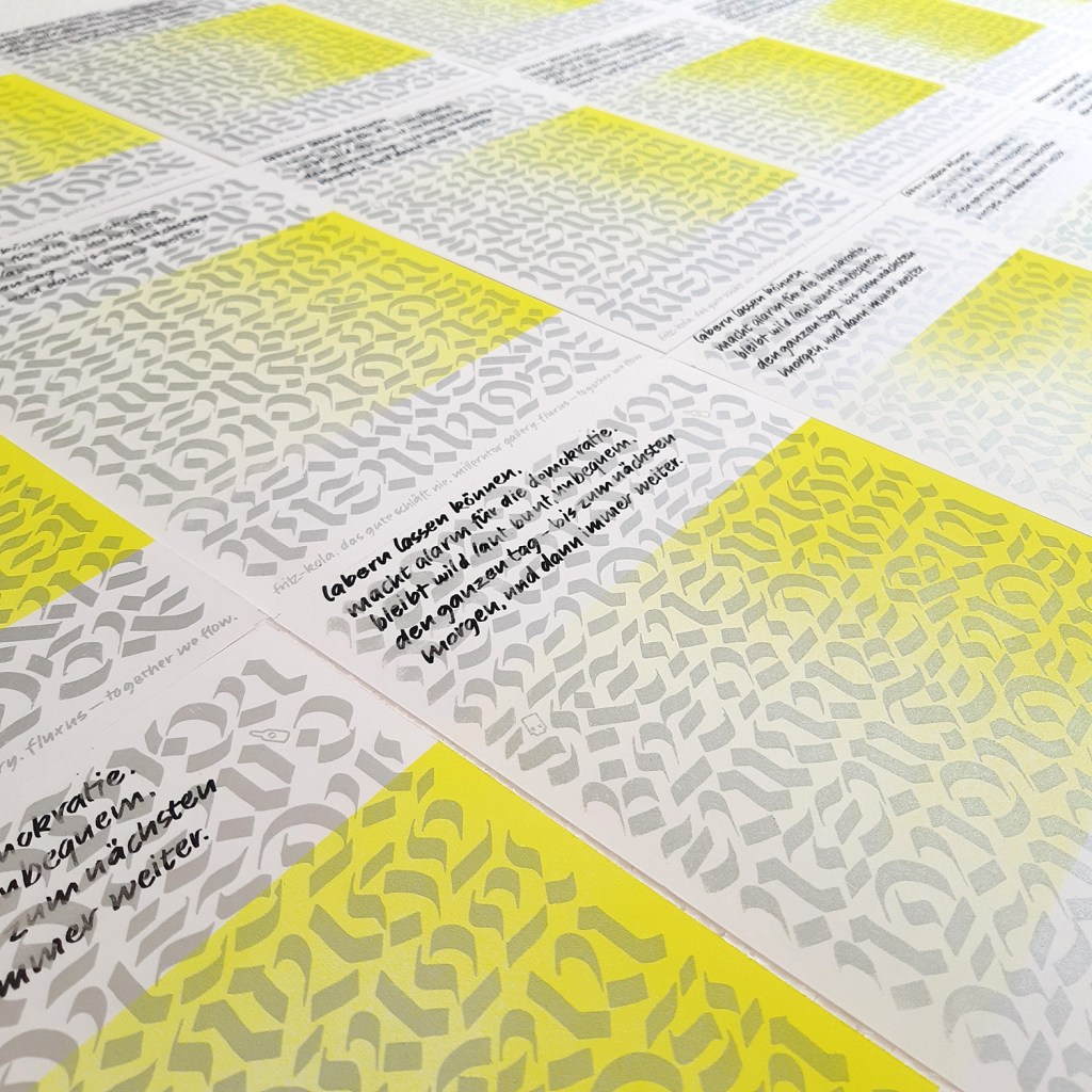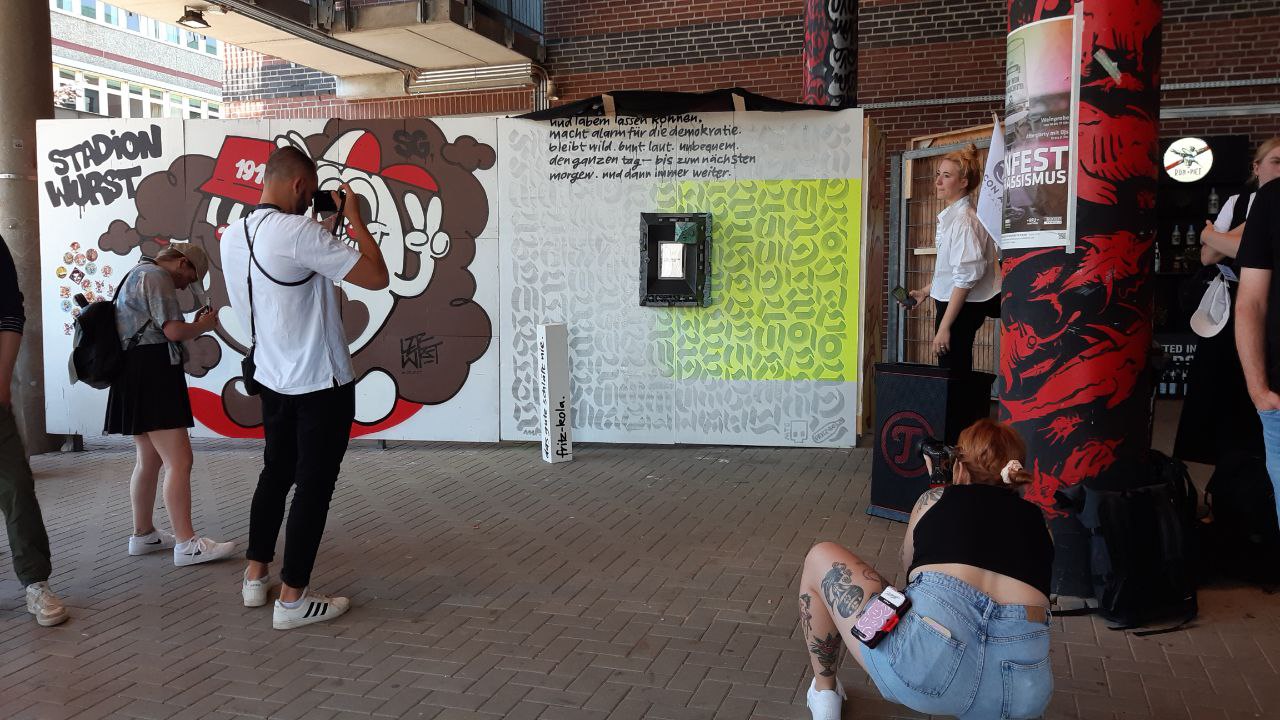 Im Sommer 2022 wurde ich von Micha Fritz angeschrieben, ob ich für das Demokratie-Manifest von Fritz Kola und Viva Con Agua eine Wand zur Ausstellung »FLUXUS« in der Millerntor Gallery schreiben würde.