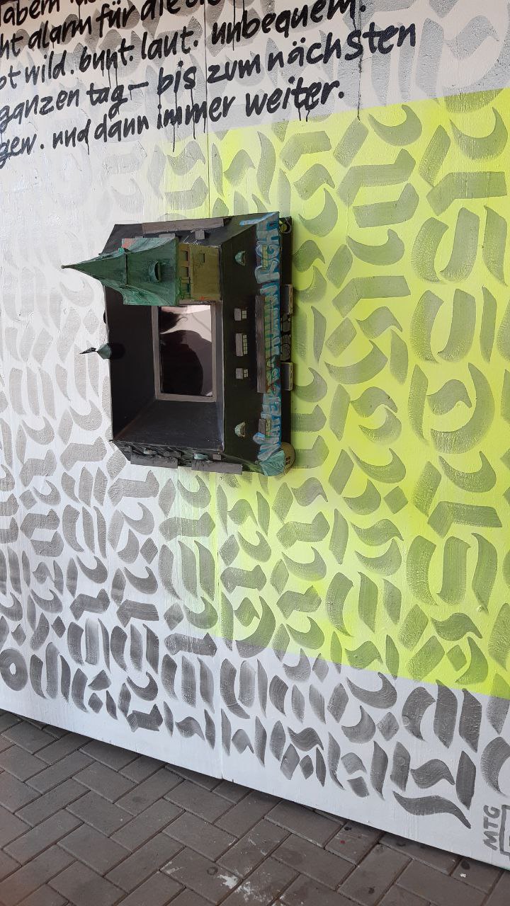 Der Text auf der Wand gibt das Manifest wieder — die silberne, aufgebrochene Fraktur im Hintergrund (alles Großbuchstaben, unverbunden — wie aufgebrochene Ketten) wird überschrieben mit einer lesbaren Schrift (alles Kleinbuchstaben, handschriftlich/stylewriting). Gerade in der Kalligrafie transportieren Schriften viel Image, da die meisten kalligrafischen Schriften im Vergleich zu z.B. heutigen Buchschriften deutlich mehr auffallen und eigensinniger sind.