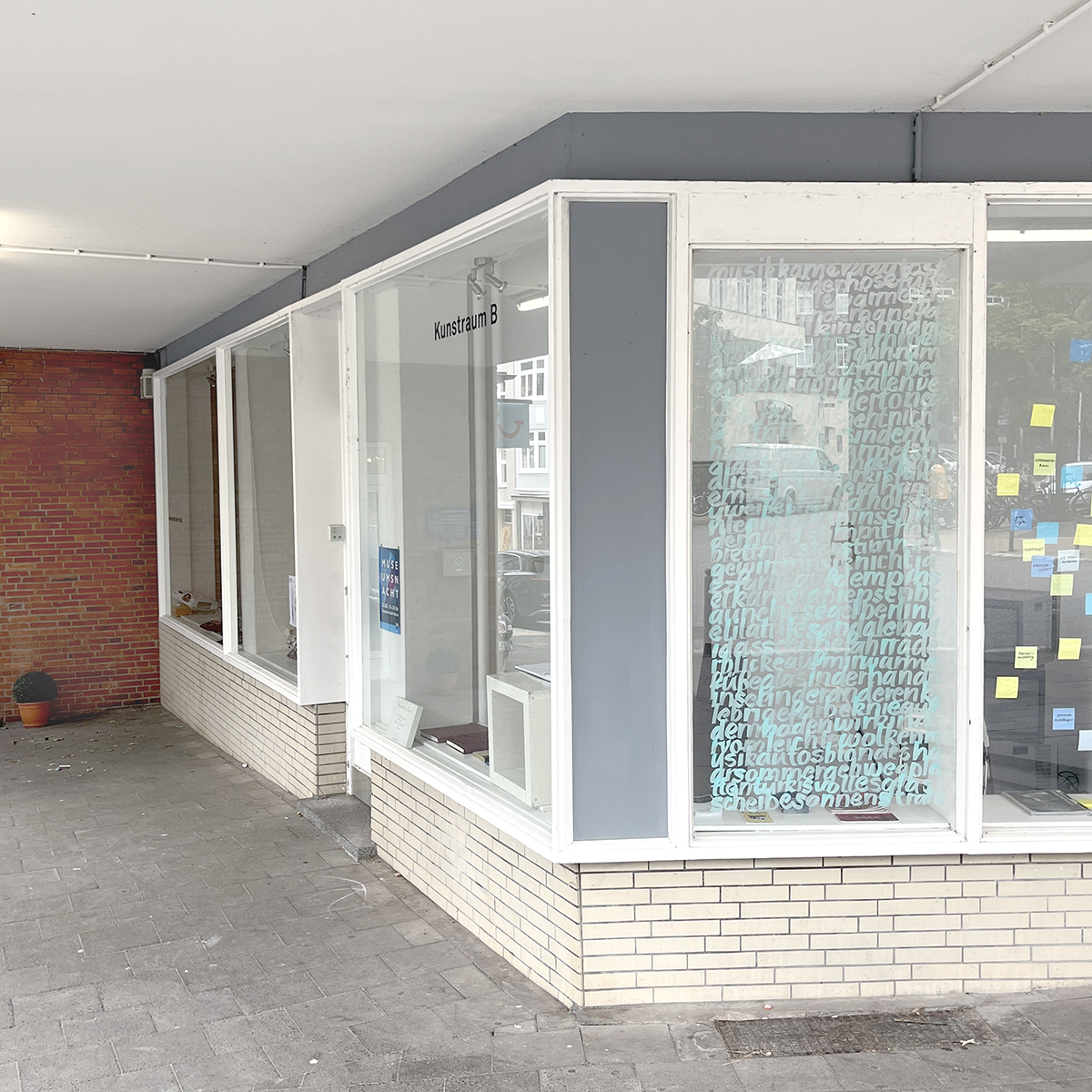 „[Em] Krallmann’s political work of the artistically designed lettering #LEAVENOONEBEHIND is already familiar to many from the city Kiel in northern Germany. A temporary work with a conceptual approach was created for Kunstraum B and the anniversary exhibition: „lightcloudsmusicautosblondehairsummersidewaysslabsturqouisevullglassdiscsunbeam“ was created using the 5-4-3-2-1 method. The terms that can be deciphered name, in order, five things that the artist heard while writing, five that they saw and five that they felt. The sequence of senses is then repeated in the numbers four, three, two and one. This method sharpens their own perception and at the same time manifests the impressions in an almost meditative act of artistic writing, which in turn connects the inside with the outside.