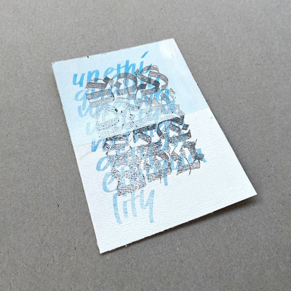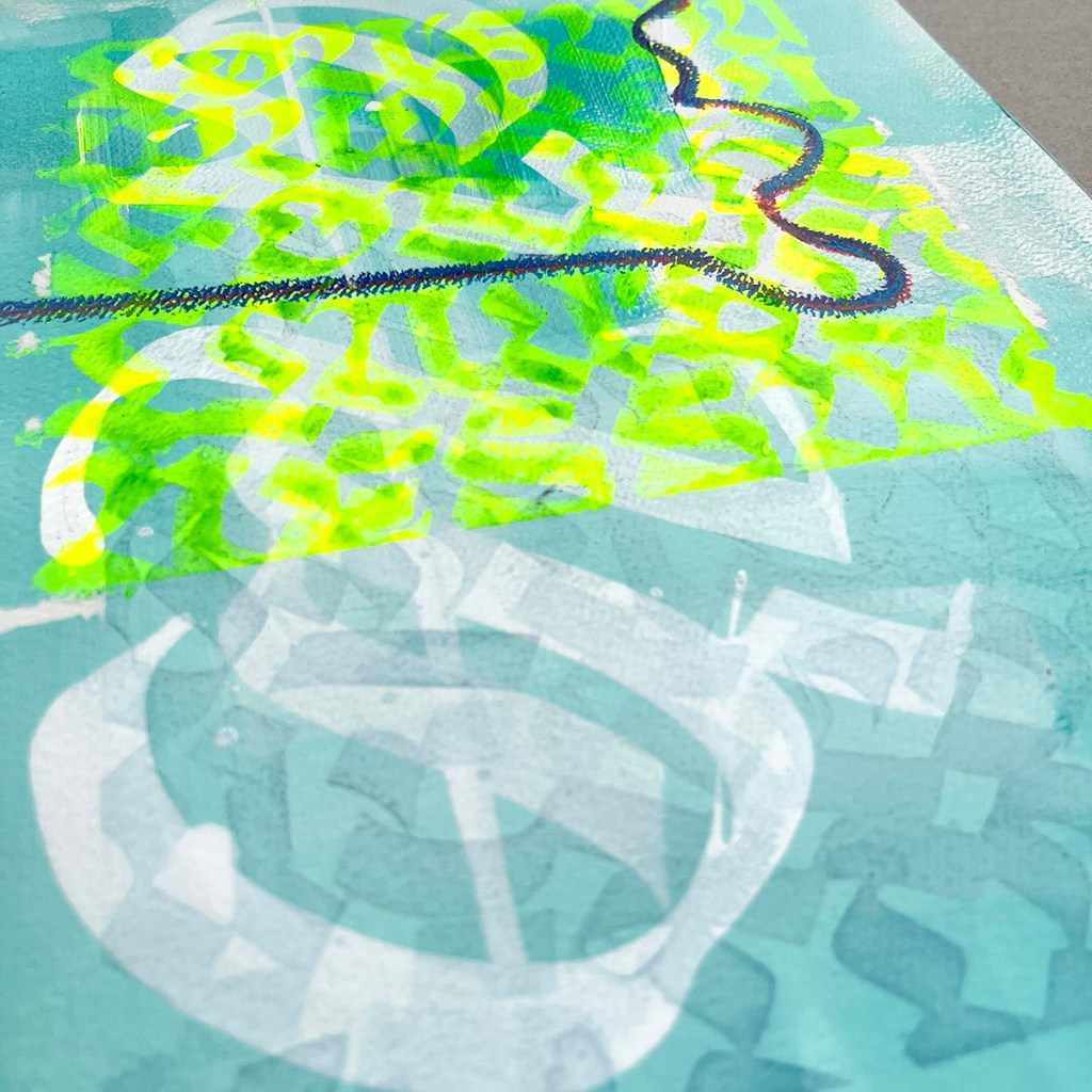 »I gave you all the things I mean another« oder »finding out o super« sind solche versteckten Botschaften an mich selbst. In der Umsetzung kann ich sie wieder lesen — für die Betrachter*innen entsteht aber ein abstraktes Formenspiel, das Schrift andeutet aber verundeutlicht. So halte ich selbst in der Öffentlichkeit mein Tagebuch geheim und versteckt.