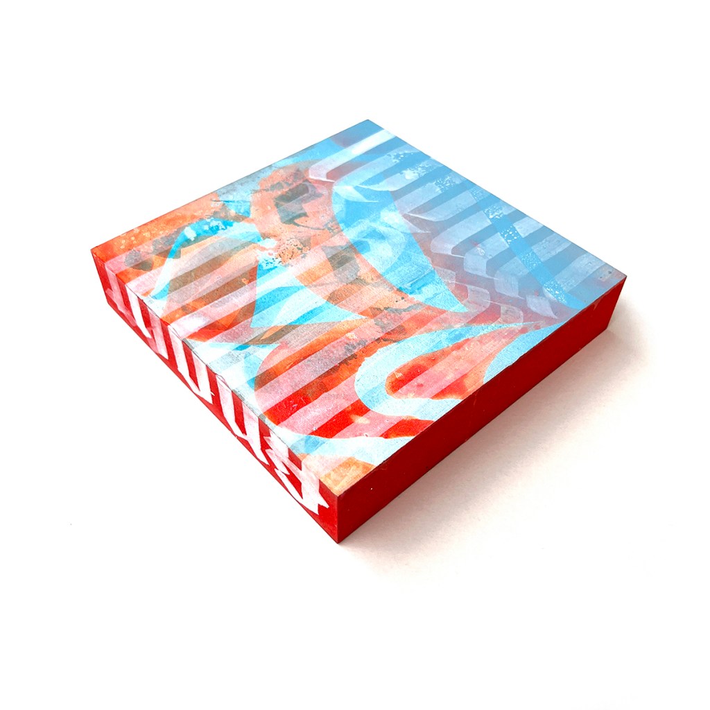 Pinsel, Acryltusche und Marker auf Holzblock, UV-protection-Spray Montana. Brush, acrylic ink and marker on wooden block, UV-protection spray Montana