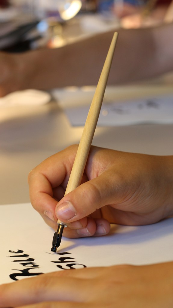 Dabei gebe ich nach Wunsch Impulse über klassische Kalligrafie-Beispiele, die europäische Schriftgeschichte oder verschiedene Materialien und Werkzeuge.